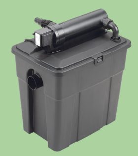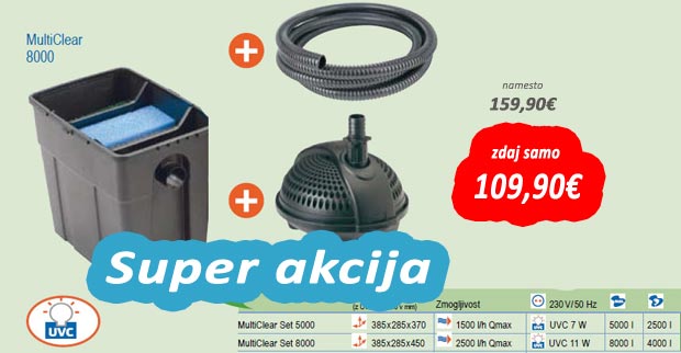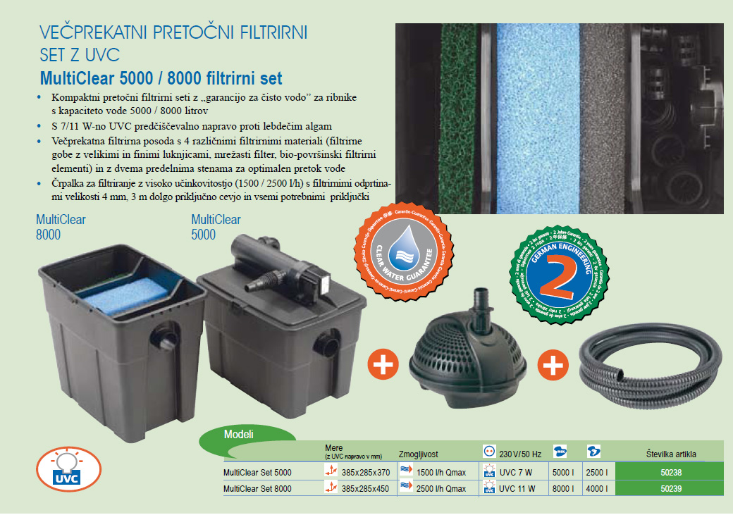 Kompaktni pretočni filtrirni seti z „garancijo za čisto vodo” za ribnike s kapaciteto vode 5000 / 8000 litrov S 7/11 W-no UVC predčiščevalno napravo proti lebdečim algam Večprekatna filtrirna posoda s 4 različnimi filtrirnimi materiali (filtrirne gobe z velikimi in finimi luknjicami, mrežasti filter, bio-površinski filtrirni elementi) in z dvema predelnima stenama za optimalen pretok vode Črpalka za filtriranje z visoko učinkovitostjo (1500 / 2500 l/h) s filtrirnimi odprtinami velikosti 4 mm, 3 m dolgo priključno cevjo in vsemi potrebnimi priključki.
