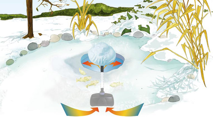 Naprava zdržuje del površine vašega ribnika pozimi nezaledenelega, tako da črpa toplejšo vodo iz dna ribnika na površje.